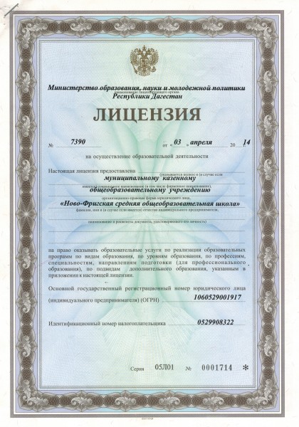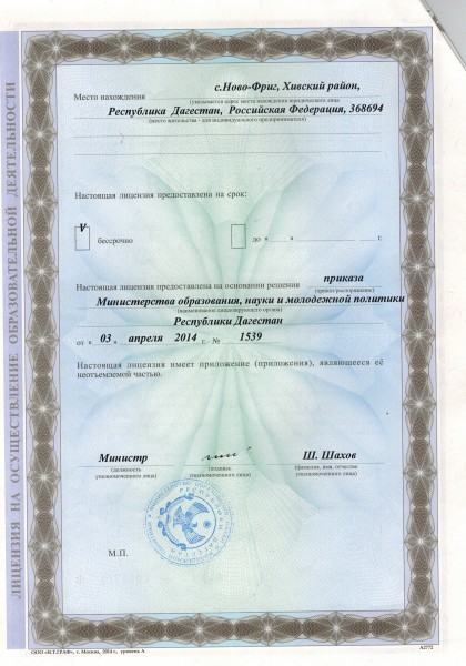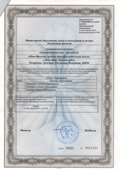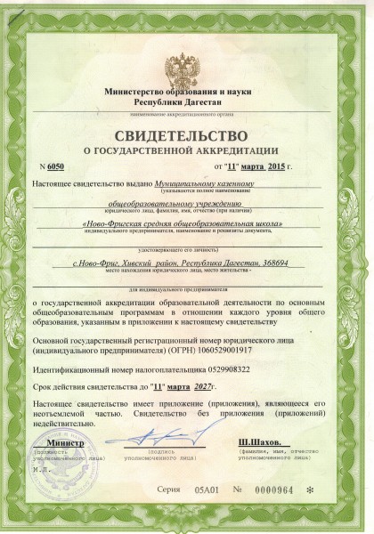 | Адрес местонахождения образовательной организации* | 368694 РЕСПУБЛИКА ДАГЕСТАН РАЙОН ХИВСКИЙ СЕЛО Новый Фриг |